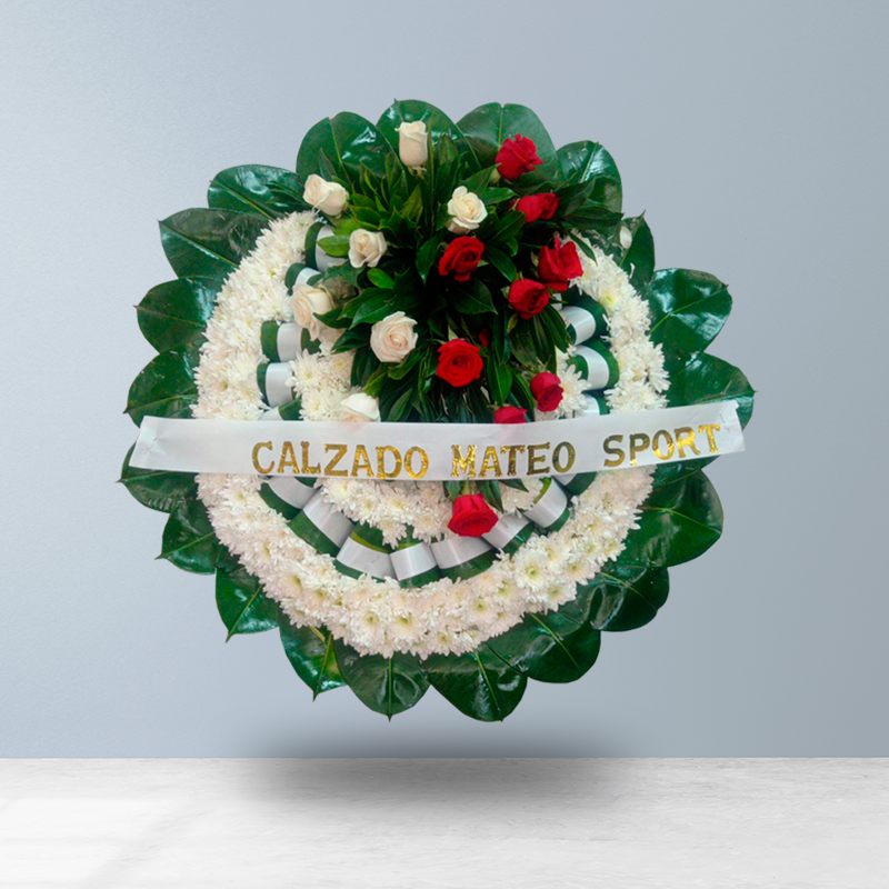 Cinta personalizada: Una cinta blanca atraviesa la corona, llevando un mensaje personalizado. Esto añade un toque personal y significativo al homenaje, posiblemente indicando una conexión o patrocinio.